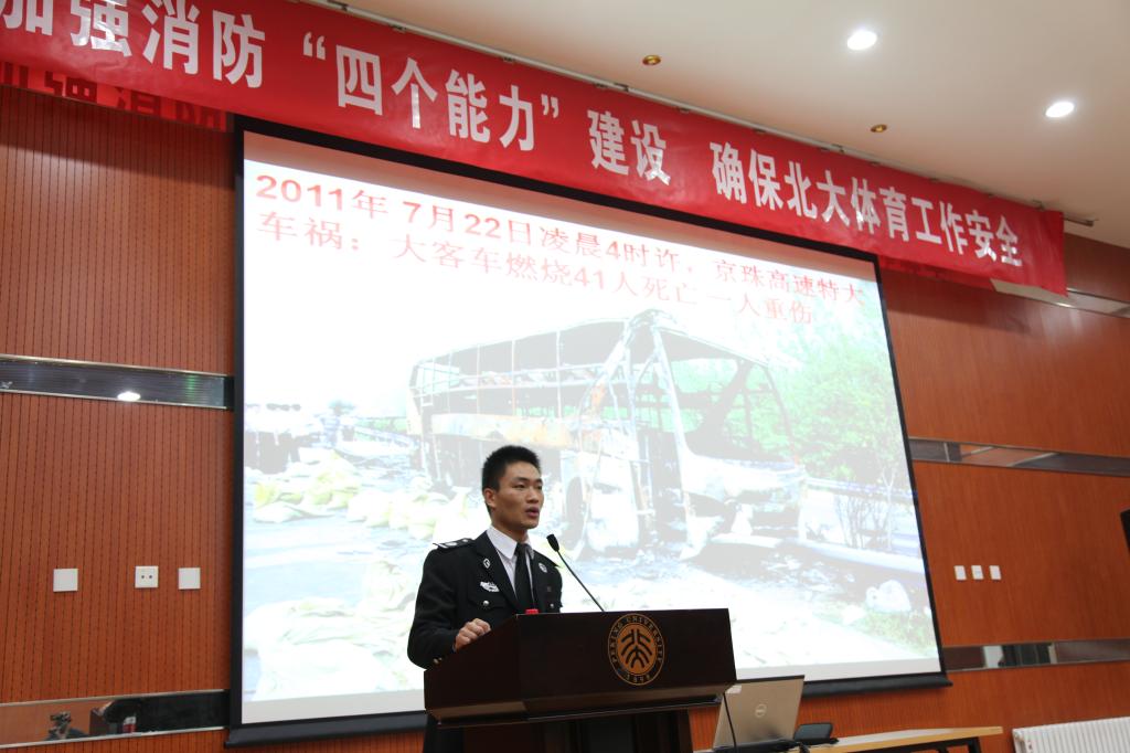 2012年10月26日下午,北京大学体育教研部以“学习促安全,喜迎十八大”为主题,在邱德拔体育馆多功能厅举办以“加强消防‘四个能力’建设,确保北大体育工作安全”为内容的安全培训,此次培训邀请到专业的消防教官为大家讲解了消防基础知识。体育部全体教师、体育场馆工作人员和外聘场馆工作人员一同学习了消防安全知识与自救常识。