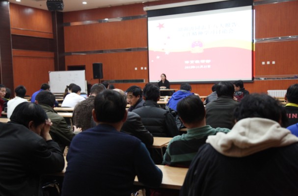 11月21日下午5点,体育部全体教师聚集在邱德拔体育馆多功能厅,学习贯彻党的十八大精神。张锐书记首先介绍了北大党委书记暨十八大中央委员会候补委员朱善璐向全校各院系传达会议精神的情况,以及上一场讨论会离退休老教师的发言成果。张书记认为,十八大报告意义深远,让离退休老教师们看到了希望,对体教部的未来发展具有重要的指导作用。