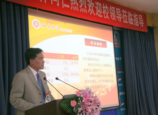 他指出近年来北大体育部组织结构不断完善,师资队伍不断增强,专业水平不断提高。教师职称比例和学历水平与同类学校相比,在学科建设与发展中具有较强的竞争力。在体育课程设置方面北大在全国综合性大学中名列前茅。体育部不断探索新的教学组织形式,实现了由“三自主”到“四自主”再到“五自主”的教学形式跨越,基本形成了学生自选时间、自选项目、自选教师、任选学期、自主锻炼的形式。同时不断推出教学管理新举措,采取更为合理与严格的管理形式。这些改革不仅仅受到了在校学生的普遍欢迎,而且也先后获得了国家级、北京市以及北京大学的各项荣誉和奖励。在运动训练与竞赛方面,体育部坚持“团结、信念、责任、荣誉”的发展理念,建设高水平运动队,培养了大批高水平运动员,在各项赛事上取得了优异成绩。体育部高度重视体育科研与学科建设,以人文体育研究基地、北大体育科学研究所为平台,积极开展学术研究及交流活动。郝光安主任指出体育部近年来科研经费稳步增长,科研项目立项数量不断增加,核心期刊论文、著作的质量和数量都呈现了上升的趋势,取得了丰硕的科研成果。同时体育部还广泛同国内外大学展开学术交流活动。