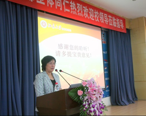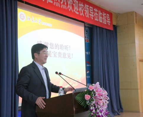 调研报告会上,郝光安主任做了以“科学发展体育工作––北京大学体育工作建设”为主题的工作汇报,详细介绍了近年来北京大学体育工作的发展情况,并提出了“建设世界一流的大学体育”的发展目标。