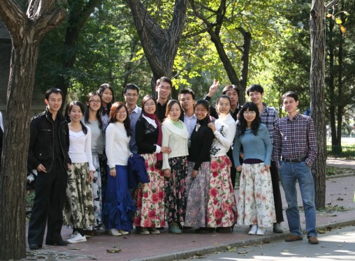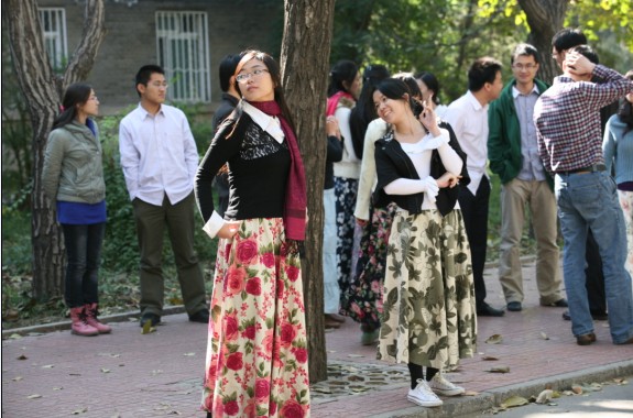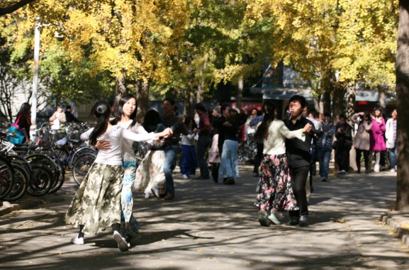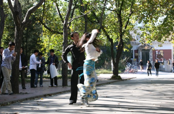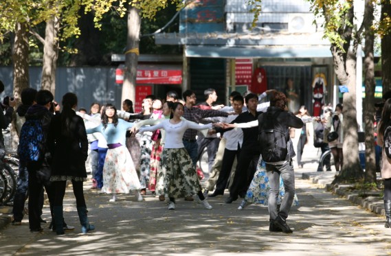10月25日中午12点,正值校园下课时人流高峰期;在31楼前的人行道上,却突然响起了朴树的《白桦林》。随着静静流淌的音乐,出现了几个穿着印花长裙的女孩,她们如翩跹的彩蝶一般,和着优美动人的旋律,与男伴搭手,沿着黄叶纷飞的人行道翩翩起舞。许多同学被乐声和舞蹈吸引,纷纷驻足。只见秋日灿烂的阳光下,银杏树的华盖中隐隐露出一弯苍穹,银杏叶似乎也为此时的气氛所动而缓缓飘落。男生虽然身着便服,但挺拔的身姿、高雅的气质使他们如同一位位校园绅士;女生裙角飞扬,如同绽开了一朵朵绚丽的鲜花,成为色彩明丽的一道风景。他们跳着维也纳华尔兹的舞步,在金色的秋日映衬下,形成了一幅唯美的画面。