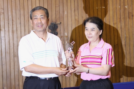 北京市大学生体育协会主席杜松彭为女单冠军颁奖