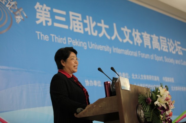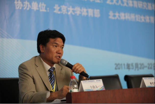 岳素兰教授做了题为《体育事关民生大计,民生助推体育发展》的发言,为本次论坛的主题“体育与民生”进行了最好的注解。岳教授首先引出了整个话题,她指出,奥运后,由体育触发的文化现象和多元功能,催生了“民生体育”的悄然兴起,她认为民生体育建设的理论诉求越来越具有现实意义。民生体育的应运而生,契合了“后奥运”时代特征、体育运动健康发展规律以及国民幸福指数提升的需求。政府和社会各界正着力改善体育领域内的民生问题,让体育惠及百姓,使体育的功能真正得以体现。岳素兰教授指出,体育有助于民生的发展,体育是经济建设和社会进步的重要标志,体育的发展更有助于国民健康。而体育产业的发展,和体育对国家立法与行政的促进要求,也说明了体育与民生的密切关系。最后,她着重强调了“教育是民生之基”,大学体育既是高等教育的重要组成部分,也是社会民生和民生体育的重要分支领域,受到社会普遍关注。她介绍了在横亘两个世纪的时间里,北大人以独特的学术视野,提出并践行了“完全人格,首在体育” 这一“体育是人全面发展需要”的前瞻性教育主张,既推动了“育体与育心并重”的素质教育,又丰富了民生体育的内涵。最后,岳教授提出,当前,我们应从迈向“教育强国”和“体育强国”的全局高度和民生体育建设的鲜活角度来推动“大体育观”理念方面的探索与实践, 这既是恪守学术使命和坚持社会责任,也是对“后奥运”时代大学体育科学发展的诠释。