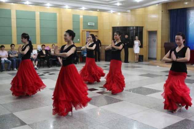 上半场的演出由北大体育舞蹈队女生奉献的集体舞开场,5位窈窕淑女身着黑色舞版上衣、红色落地长裙摇曳起舞,从阿根廷探戈到弗拉明戈、从拉丁风情恰恰到印度舞,婀娜多姿,娇媚妖娆。随着音乐风格骤变,女生们霍然脱掉长裙,露出短裤,开始了激情的现代舞,Ladygaga、Nobody等时下流行音乐的元素融入其中,尽显青春的魅力。