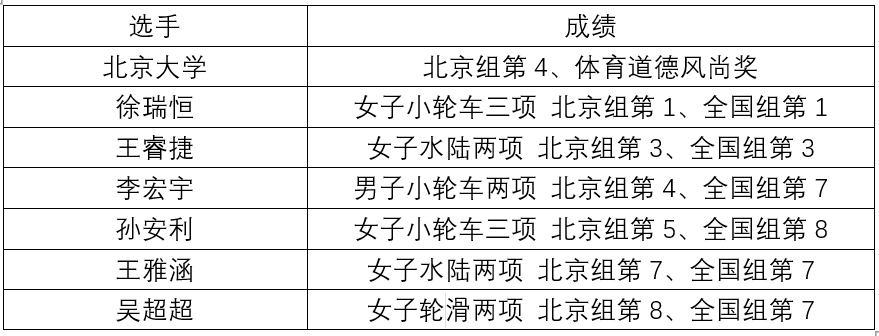 本校由刘铮老师带领10位选手,包括五名女子组选手:王睿捷、王雅涵、吴超超、孙安利、徐瑞恒,以及五名男子组选手:李宏宇、吴广启、米元博、滕达、蔡寰宸。其中多位选手夺得北京及全国前8,北大更创下参赛以来队史最佳成绩:北京组第4名,并荣获体育道德风尚奖。