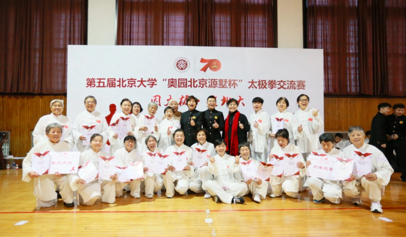 2019年12月21日上午,第五届北京大学“奥园北京源墅杯”太极拳交流赛在北京大学第一体育馆成功举办。来自北京大学太极拳必修课程班、教职工未名太极社、信科、法学院、经济学院、物理学院、学科办、校医院、会议中心、图书馆和燕园街道等48支队伍、240名选手参加了此次太极拳交流赛。本次比赛由北京大学武术研究中心、北京大学体育教研部、北京大学工会、北京大学燕园街道办事处联合主办,中国老龄事业发展研究中心、北京大学体医融合创新实验室和北京大学未名太极社协办。