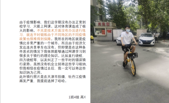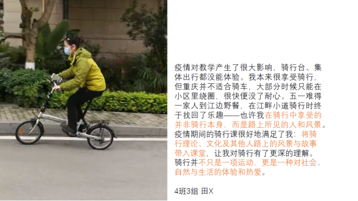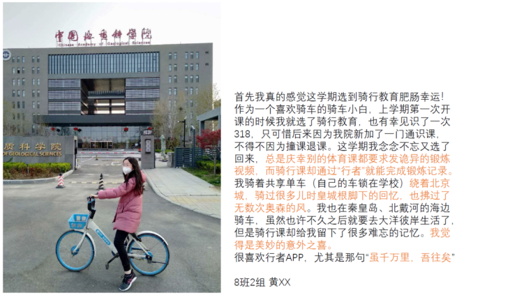 张老师:谢谢卢老师。共享单车已经进入北大体育课程。2019-2020学年第二学期,也就是在疫情期间,北大的骑行教育课程的实践内容,就是教会分散在全国各地的学生们,如何利用身边的自行车,无论是运动自行车,通勤车还是共享单车,去进行实践。我们老师(其实就是卢老师)还专门用共享单车,拍摄了系列教学视频,从车子的选择,骑行姿势的设定,骑行的主要技巧,以及控车技术的训练等等。我们的骑行教育课程,要传递的信息是,它不是传统的体育技能课,而是生活方式教育,绿色出行教育,同时也是健康和安全教育。真正评估课程的,不是一个学期课程后考试的成绩,而是课程结束后骑行是否真正改善了他们的生活方式,使得他们热爱骑行出行,既有“读万卷书,行万里路“的豪情,也有”融入自然,深入社会的情怀与责任”。大家可以观看屏幕分享的课程总结信息,我特意挑出三张照片和一个同学作为代表,来表明疫情期间骑行教育课程同学们使用三大共享单车作为课程教学实验用车。