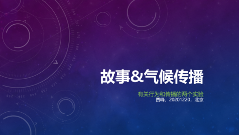 中国生态环境部宣教中心贾峰主任受邀在线报告了“故事&气候传播”,用中国低碳绿色消费方式转型行为实验和低碳绿色传播实验,来说明“绿色骑行”的公众参与需要传播扩大/施加影响。贾峰认为恰当的传播增进公众参与号召力和忠诚度。他以北京回龙观到西二旗的高速自行车路利用率和知名度不高为例,来解释传统的传播因为宣传主体的权限受制(酒香也怕巷子深),以及跨部门传播过程中的尬尴(三个和尚无水吃)。他以自身微博的传播作为例子:150天大约46篇与骑行相关的微博,平均三天一篇。原创阅读量均能过5000;其中过万阅读量21篇,占比53%,大多与抄送若干大V(5-6位)有关;较高阅读量故事性较强;10W+有5篇,最多超过22万。互动270多。因此他认为,好的故事成功了一半,好的渠道事半功倍,唤起受众的兴趣很重要。要讲好传播故事,贾峰认为以下5个要素很重要: