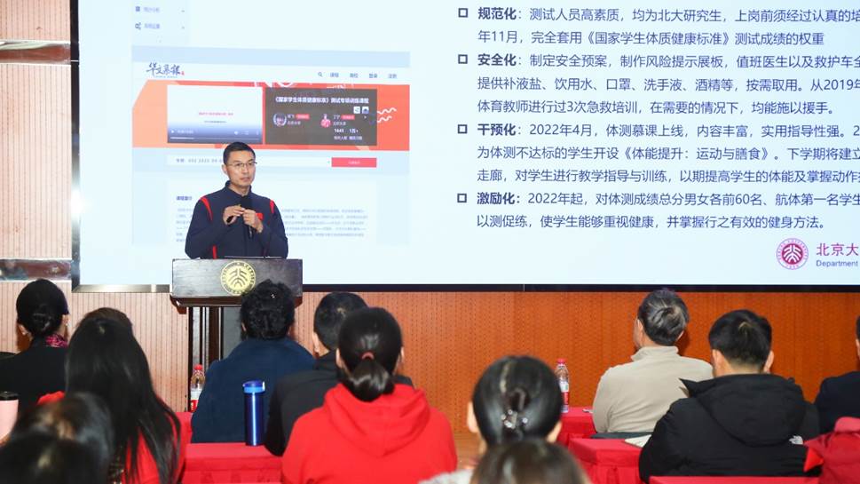 首先,体育教研部主任钱俊伟介绍了北京大学体育教学情况。从师资队伍、课程设置、规章制度、课程思政、疫情期间教学经验、学生体质监测工作、教学奖项、课堂模式创新等多个方面,详细地介绍了北京大学的体育教学实践。他表示,北大体育教育将不负时代使命,坚持健康第一的教育理念,落实立德树人根本任务,培养学生强健的体格、健全的人格,为强国建设、民族复兴贡献力量。