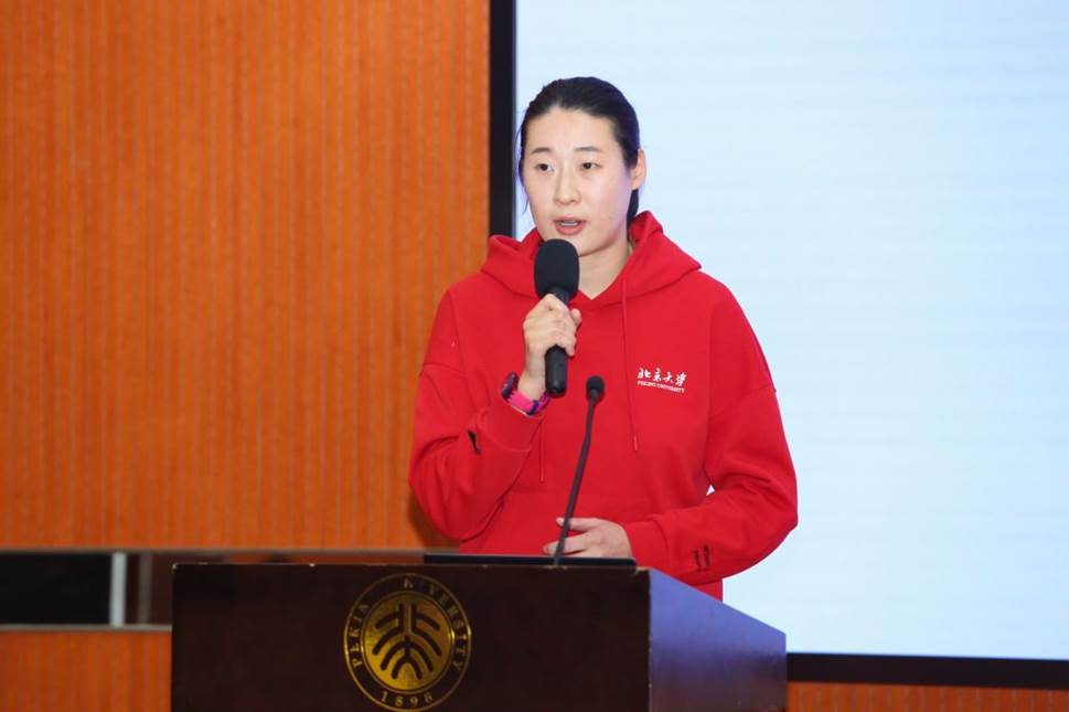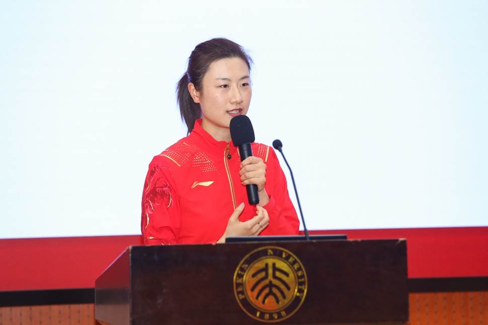 丁宁发言。她回顾自己的运动员生涯,从5岁开始练习乒乓球,13岁进入国家队,再到成为世界冠军、奥运冠军,一路上经历了诸多挑战和困难,正是不畏困难、勇于拼搏、追求卓越、为国而战的国乒精神鼓舞、支撑着她在赛场上不断拼搏。她表示自己在运动员期间就曾经给北京大学元培学院的同学们进行过一次演讲,通过与同学们的交流,她深刻意识到体育榜样能够为青年人提供巨大的精神力量。而在退役后,丁宁选择来到北京大学读书,一方面是为了把实践的经验和理论更好地结合,另一方面也是希望能够为社会做出更大的贡献,于是她担任了吴飞老师乒乓球课程的助教,这段经历也成为她选择从教的主要原因。正式入职后,丁宁认真向前辈取经,自己也下苦功夫雕琢授课技巧,力求在教学能力方面不断精进。