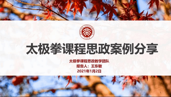 首先,由《太极拳》授课教师王东敏进行了太极拳课程思政案例交流分享。王老师讲到,北大开设太极拳必修课已有30余年的历史,近些年来北大太极拳课程思政教学团队着力进行太极拳课程思政建设,构建了教、学、练、赛、研、用的“六位一体”太极拳课程思政教学体系,形成了第一、二、三课堂相融合的“课内外一体化”思政教育生态系统,组建了跨学科、跨部门协同的课程思政教育力量,精准滴灌,使学生入耳、入眼、入脑、入心。太极拳运动处方也成为太极拳课程思政的亮点。通过对“巡天太极彰显文化自信”、“杨露禅偷学艺与工匠精神”、“杨露禅京城教拳 与创业精神”三个案例的讲解,培养学生在传承基础上的创新精神,树立科学世界观、科技强国梦;培养学生求真学问,练真本领的工匠精神、刚健自强的创业精神和民族精神、强健体魄的健康意识。激发起学生作为太极传承者和守护者的认同 感、使命感与责任感,培养起学生对中华优秀传统文化的兴趣与热爱,担起传承和弘扬中国优秀传统文化的重任。