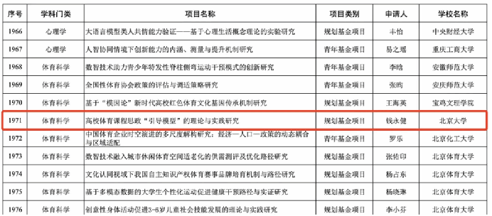在科研立项方面,钱俊伟老师主持的《我国数字体育赛事发展的风险治理研究》获批2025年国家社科基金年度项目;钱永健老师主持的《高校体育课程思政“引导模型”的理论与实践研究》获批教育部人文社会科学研究规划基金项目;张晓圆老师主持的《北京市超重肥胖大学生体重管理策略研究》获批北京市教育科学“十四五”规划2025年度一般课题。