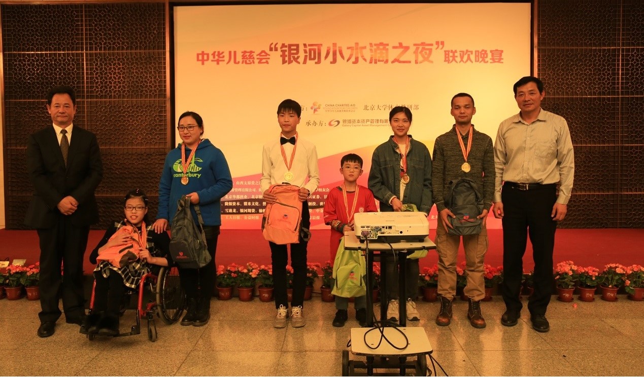 运动会颁奖典礼,移步到了当晚在北京大学正大国际中心举行的中华儿慈会“银河小水滴之夜”联欢晚宴现场进行。北京大学常务副书记于鸿君、北京大学体育教研部主任李宁,分别为获得荣誉的孩子们和田径队健儿颁发奖牌和奖杯,鼓励他们今后的生活和学习中,互动互助,努力攀登人生更高峰。