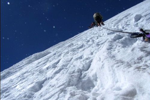 登山队员于5月1日抵达海拔4100米的哈巴大本营,经过两天短暂的休整,于5月3日凌晨4点30分从大本营出发,克服高山反应,顶着狂风进行初次冲顶尝试。由于高山气候多变,路上瞬间风力达到10级,风中并夹杂着大量雪粒,路上能见度很低,前行速度缓慢,行进多次受阻。在恶劣天气下历经5个小时的艰难跋涉,直到9点30分才到达4900米雪线。然而此时气候变得更加恶劣,当地协作要求停止冲顶并下撤,在队员们的积极要求和教练孙斌(山鹰社老队员)的科学决策下,最终决定等到10点,如果天气不好转,再下撤。天道酬勤,天气在9点45分开始好转,风速下降到4级,经验丰富的孙斌教练认为这样的风速可以冲顶,随即大家换冰爪、上安全带及上升器,继续前行。途中经冰坡1000多米,连续上升500多米,下午1点30分,三名队员全部成功登顶,北大教职工户外健身协会登山队队旗第一次飘扬在了5000米以上的高峰。
