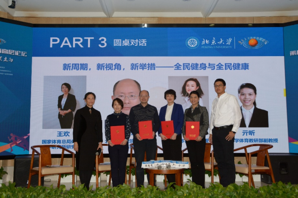 论坛第三环节圆桌对话,赫忠慧、王欢、 李迪华、严翊,亓昕五位嘉宾老师参加本次的圆桌对话,赫忠慧教授代表北京大学体育教研部致欢迎词并主持会议。