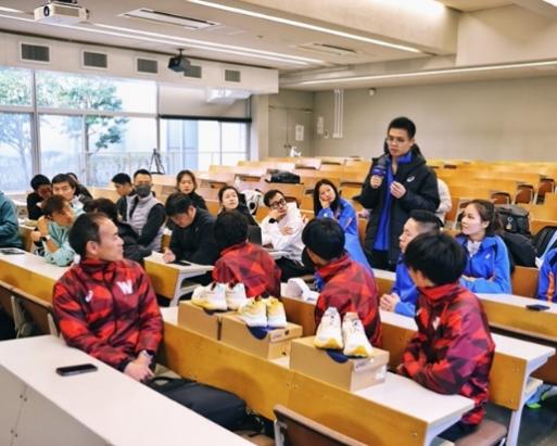 2月28日,代表团前往早稻田大学所泽校区,与该校运动科学学院及早稻田大学競走部(以下简称早大競走部)展开深度交流。早稻田大学运动科学学院的宮下政司教授为大家详细介绍了学院的学系架构与体育教育特色。