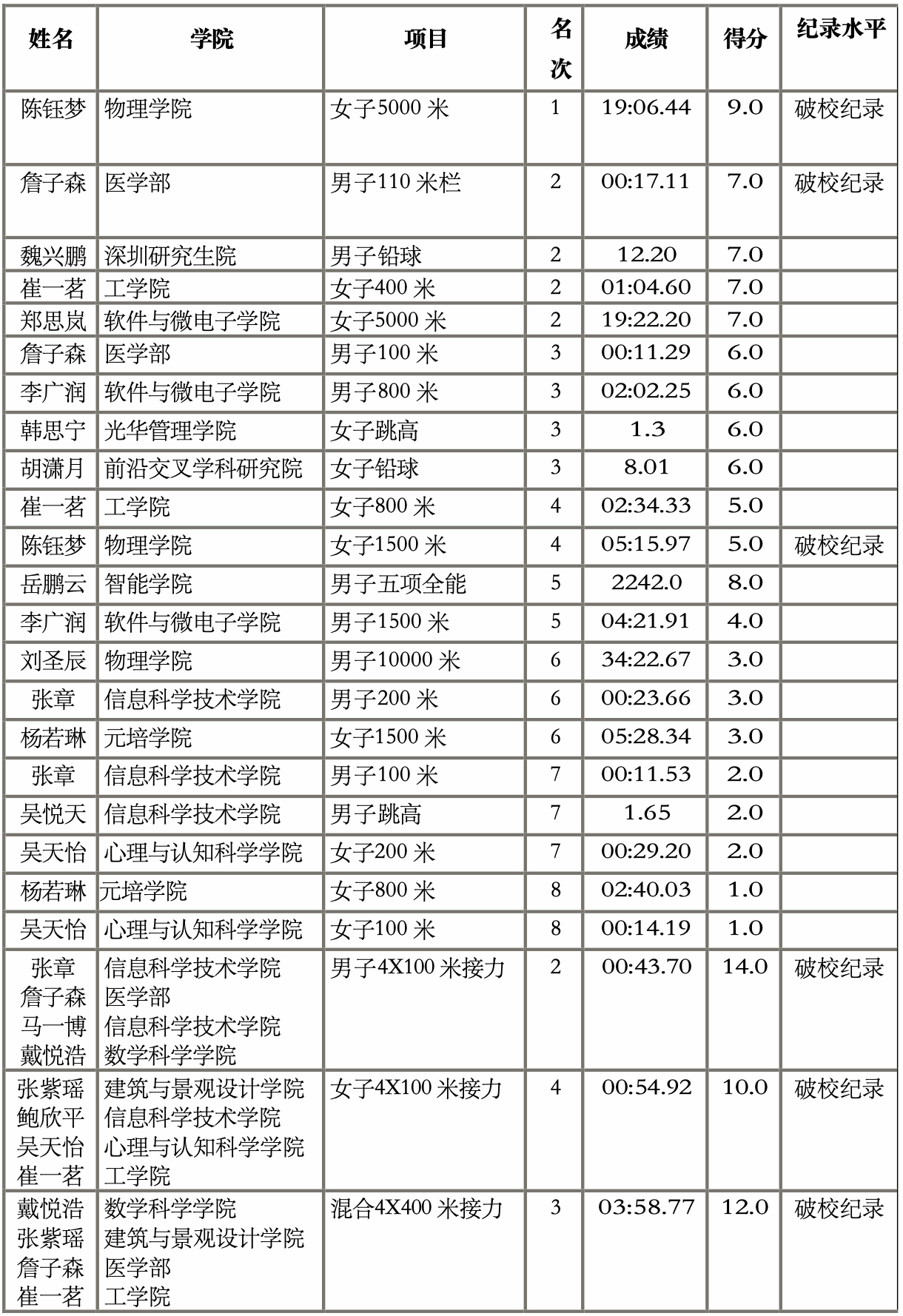 在领队王东敏老师和教练员郑重、刘茂辉、邢衍安、李玉新、李贵森、李宁、李敬敬等老师的带领下,经过3天激烈角逐,北京大学普通生田径代表队摘得1金、5银、5铜,打破6项校纪录(女子5000米,男子110米栏、女子1500米,男子4*100米接力,女子4*100米接力,混合4*400米接力),最终获得了男女团体总分第3名、最佳参赛组织奖、男子团体总分第3名和女子团体总分第4名。