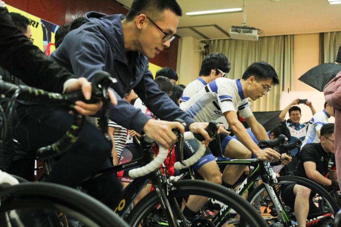 最后一个环节,是高校车队展示,北京大学车协车队,北京大学场地车队,中国矿业大学车队,中国科学院大学车队,北京大学教工车队一一亮相。简短的车队介绍之后,便开始了滚筒表演赛:1公里追逐赛。1公里是滚筒项目赛事最经典的项目,考验的是车手在高踏频下的控车能力,以及无氧供能和耐乳酸的能力。表演赛后是滚筒技巧表演,课程合作伙伴R1的李清宇老师为同学们表演了滚筒骑行套轮胎的绝活,将嘉年华推动推向最后一个高潮,同时也为29日全国大学生场地自行车滚筒锦标赛北京大学测试赛拉开一个序幕。