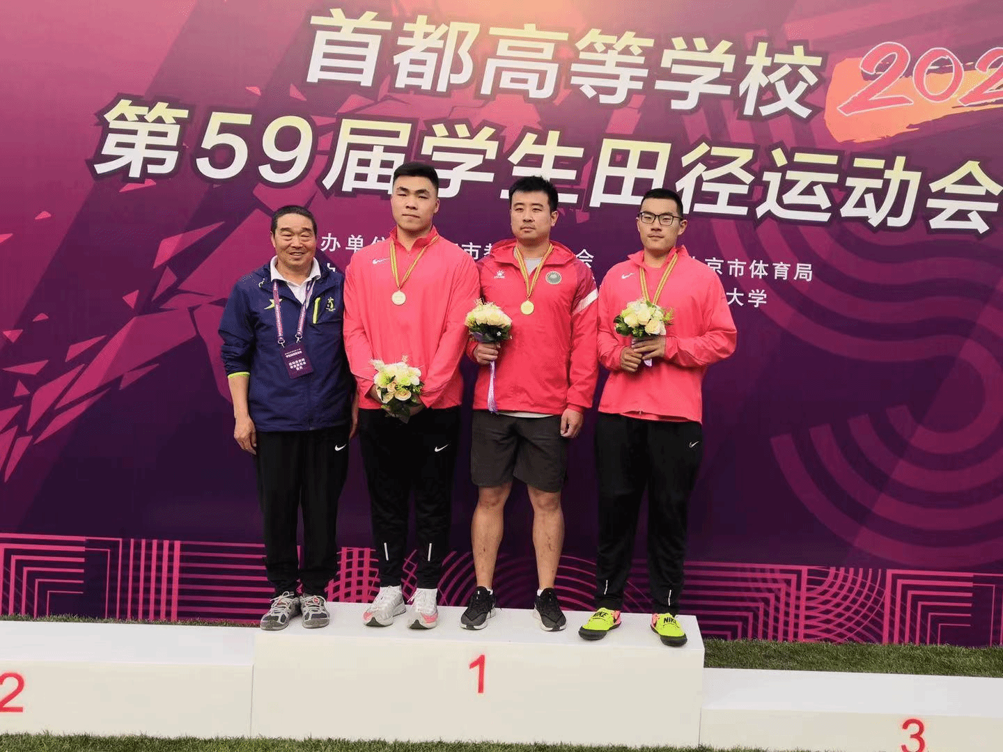 邢家梁(右二)铅球第一 郭彬然(左二)铅球第二 王浩(右一)铅球第三