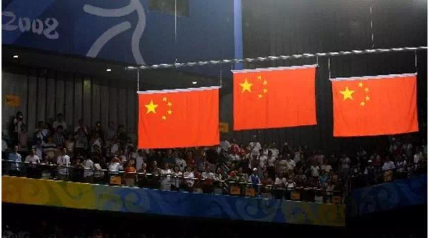 2008年奥运会乒乓球比赛,三面五星红旗在北京大学邱德拔体育馆升起