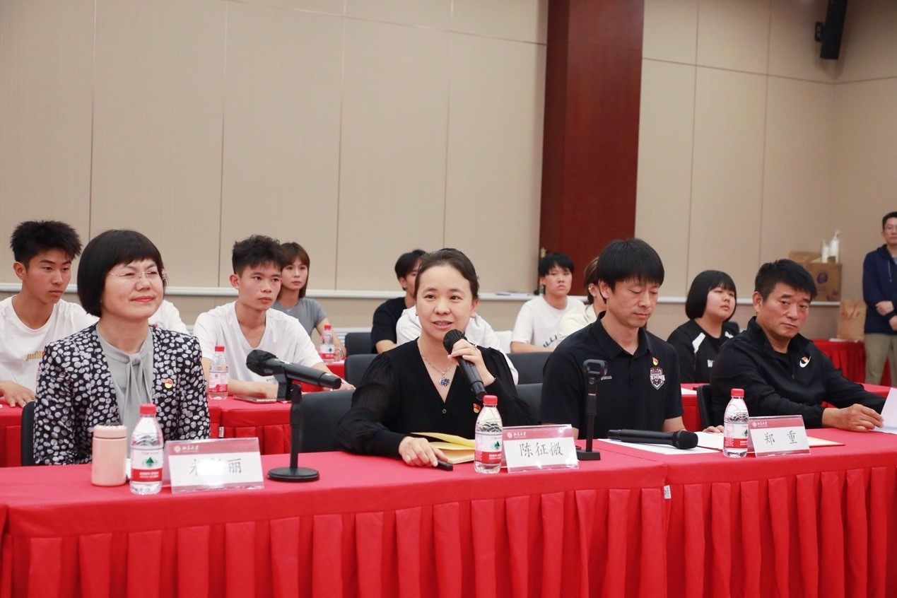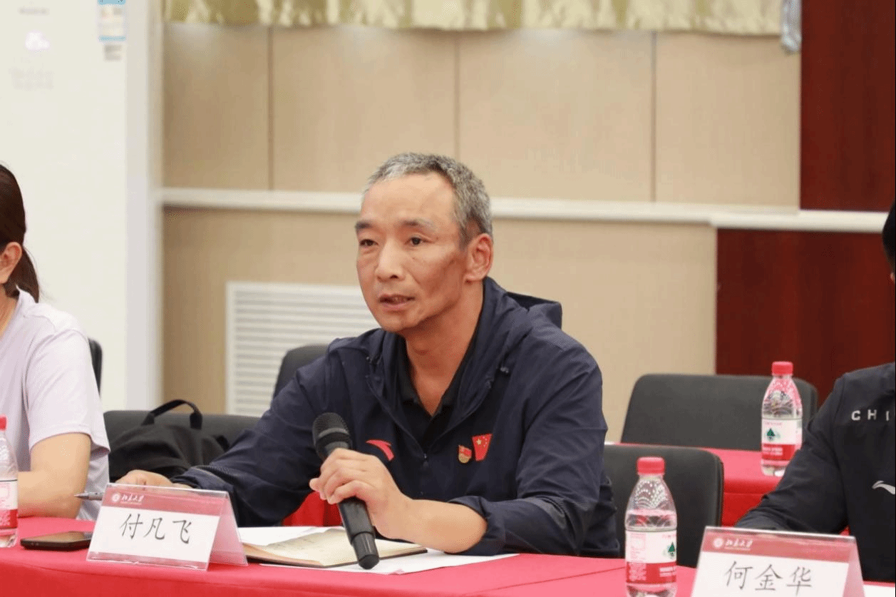 北京政法职业学院田径队教练组组长付凡飞发言,他分别从聚焦思想引领、促进政治根基,突出实践创新、服务师生需求,强化组织建设、夯实发展基础三个方面介绍了北京政法职业学院体育竞赛队伍的情况。他分享了运动队队员选拔、组织训练、等方面的经验,并期待今后能与北京大学体育教研部进行更多的学习和交流。