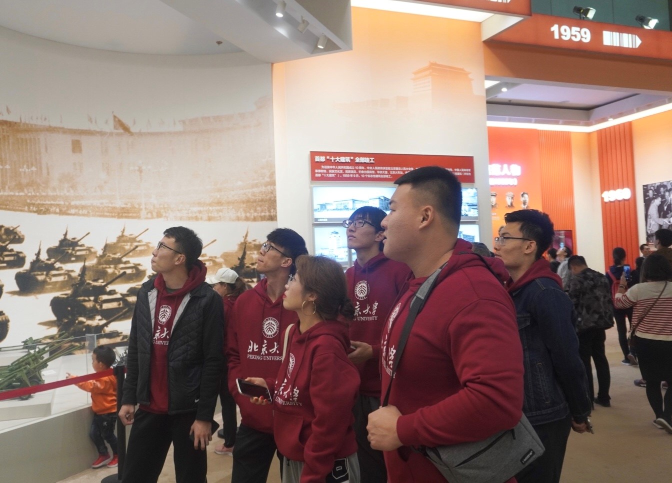 上午9时许,体教部师生步入展厅参观展览。展览以开辟和发展中国特色社会主义道路、建设社会主义现代化国家为主题,采用编年体形式,以时间为轴,事件为点,全方位回顾了从1949年到2019年共和国走过的光辉历程。通过利用声光电等多媒体科技展示手段,进行了150个“新中国第一”的展示,全方位、立体化地呈现出新中国成立70年来,中国共产党团结带领全党全国各族人民艰苦探索、不懈奋斗,成功开创和发展了中国特色社会主义,从“屹立东方”到“改革开放”再到“走向复兴”,中华民族迎来了从站起来、富起来到强起来的伟大飞跃。