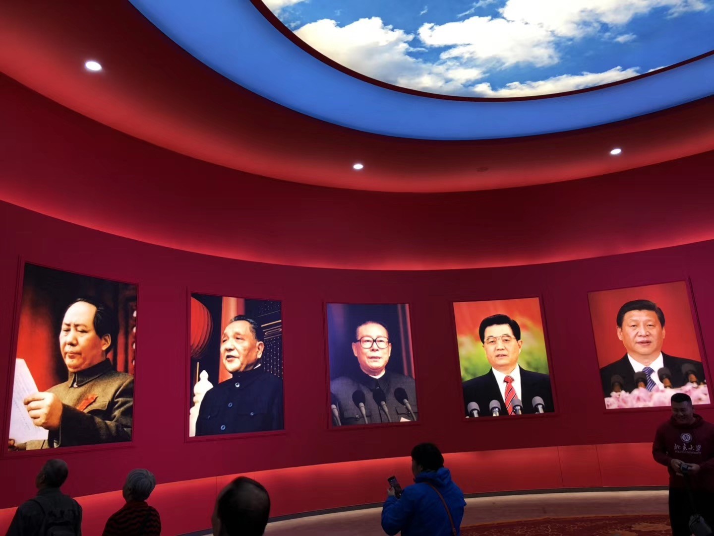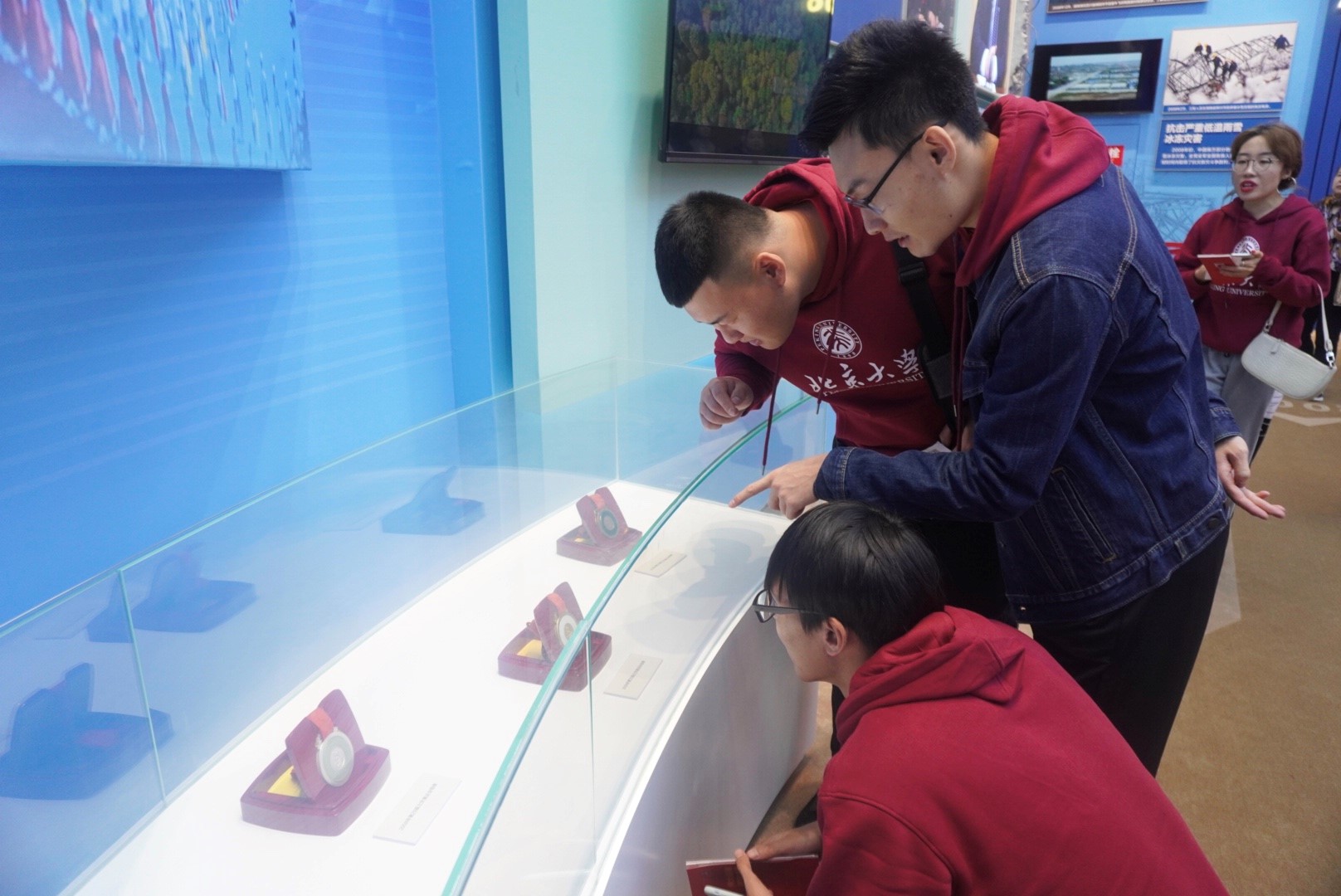 记录开国大典历史时刻的影像,纪念新中国建设的第一条铁路成渝铁路建成通车的浮雕,定格恢复中华人民共和国在联合国一切合法权利瞬间的照片,寓意1977年恢复高考以来几代人命运得以改变的场景,展现安徽小岗村18户农民在“大包干”契约上按下鲜红手印的群像,反映上海浦东开发开放旧貌换新颜的视频,显现1998年抗洪抢险中万众一心、众志成城的场面,再现北京奥运会盛况的光影设计,中国自主研发的第一座快中子反应堆模型,展现全面深化改革进程的说明,反映高质量发展的成果,体现“绿水青山就是金山银山”生动实践的沙盘,展示人民军队官兵在强军目标指引下奋勇前进的展板,呈现脱贫攻坚新进展的实景,描绘区域发展战略的地图,模拟月球车、“天眼”等的模型,世界最长跨海大桥港珠澳大桥模型,体现全方位外交的展板……展览长廊犹如时光隧道,一张张图片展板、一件件实物模型、一段段视频资料、一项项互动体验,吸引了全体党员和入党积极分子的目光,他们不时驻足观看,认真听取讲解,询问有关情况。