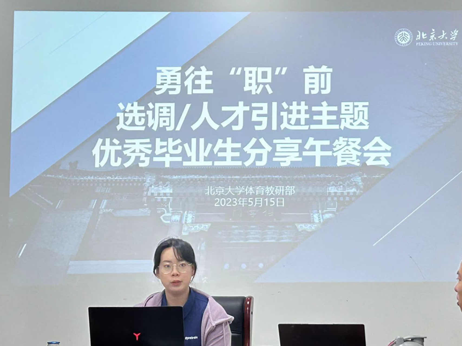2023年5月15日中午,“勇往‘职’前”系列就业沙龙活动第三期——选调/人才引进主题分享会在五四体育中心321会议室成功举办,体育教研部党委副书记王东敏老师、学生工作办公室主任杨雅晰老师、2021级优秀硕士毕业生赵伯楠、谢书妍、何惠民三位分享嘉宾以及2022级体教部全体硕士生参加本次活动。
