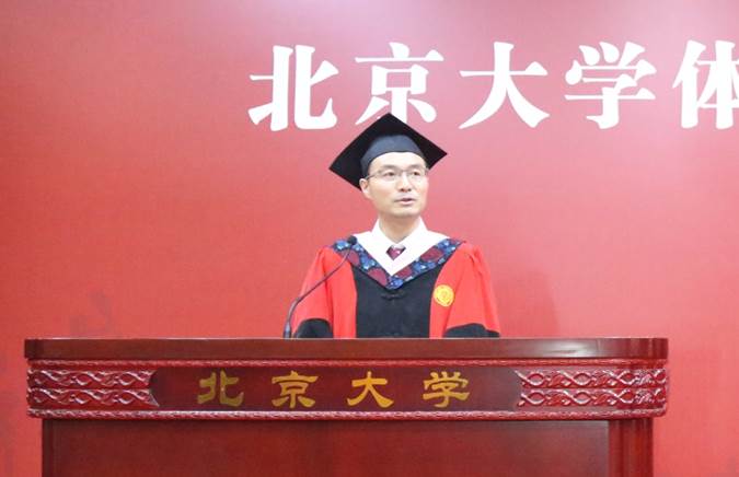 教师代表李宁教授发言。他表示,同学们从北大体教部毕业,他们的人生已经打上了体育的烙印。他希望同学们无论以后继续深造,还是就业工作,所从事是否与体育相关,都要以丰厚体育精神为依托,用竞争、合作、拼搏、顽强争取未来的超越、实现希望,以更快、更高、更强、更团结的精神跨越障碍、克服困难,以公平、公正、公开的准则创造美好的社会。他希望同学们在竞争中成长,但同时要避免过度竞争。他希望同学们在面对大变局时积极投入到国家发展中,将自己的人生与中国的未来联系在一起。