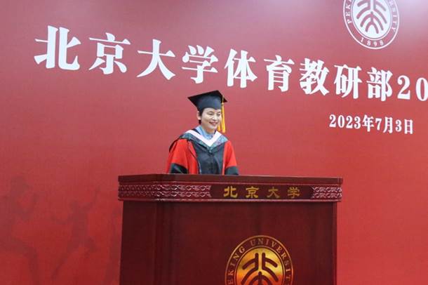 2023届毕业生代表牛建华同学发言。作为最后一届学术型硕士生,她回顾了自己三年的学习生活,总结出实现人生目标的关键是:能坚持、有担当。一路走来,风尘仆仆,是对未来的向往,对梦想的追寻让她坚持到了这里。她思考了未来的人生旅途将是一场全新的挑战,作为新时代的青年,我们要如何度过?她认为要时时提醒自己理解好、处理好“小”和“大”的关系。北大体育人的使命,是在时代变局中激浊扬清,是在日复一日的平凡中助力体育强国和健康中国建设。牛建华希望同学们在未来的道路上要始终听从内心的召唤,突破现实的羁绊,追求有意义、有价值的人生目标。
