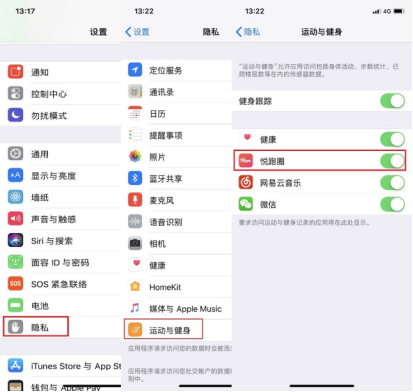 第三步打开并允许健身跟踪:打开 【手机设置】-【隐私】-【运动与健身】-找到并打开【悦跑圈】