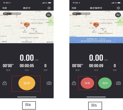 3.5、跑步结束后,请点击【暂停】按钮,如图4,暂停后长按【结束】按钮即可结束本次跑步,如图5;