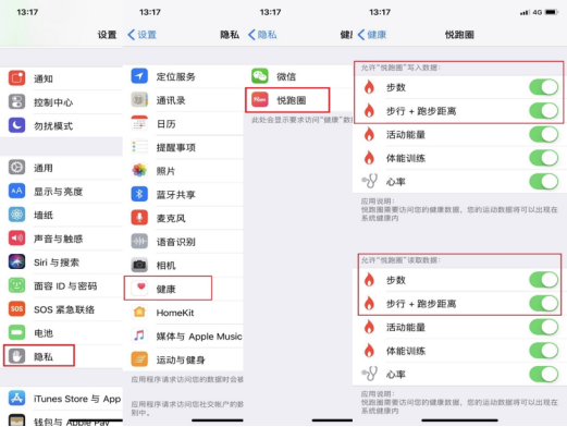 第二步允许读取步数:打开【手机设置】-【隐私】-点击【健康】-点击【悦跑圈】-允许读取【步数】【步行+跑步距离】