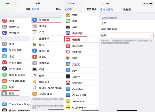 IOS用户,第一步打开定位服务,打开【手机设置】-【隐私】-【定位服务】-找到并点击【悦跑圈】-选择【始终】;