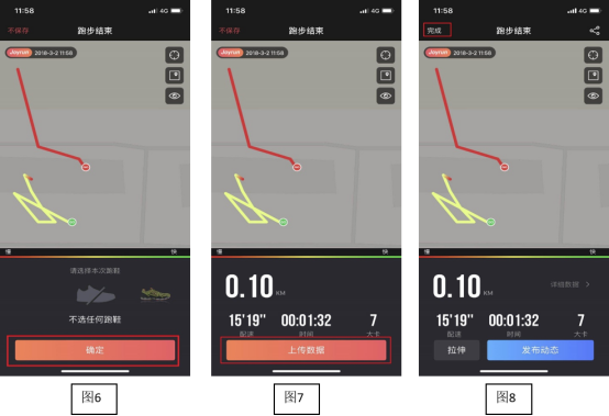 3.6、结束跑步后,点击【确定】,这个步骤可以选择自己跑步时所穿的跑鞋,没有添加跑鞋的情况下可以不选择,直接点击【确定】,如图6,然后点击【上传数据】,如图7上传数据过程中手机须使用wifi或移动流量连接互联网,点击右上角【完成】,如图8,本次跑步结束。