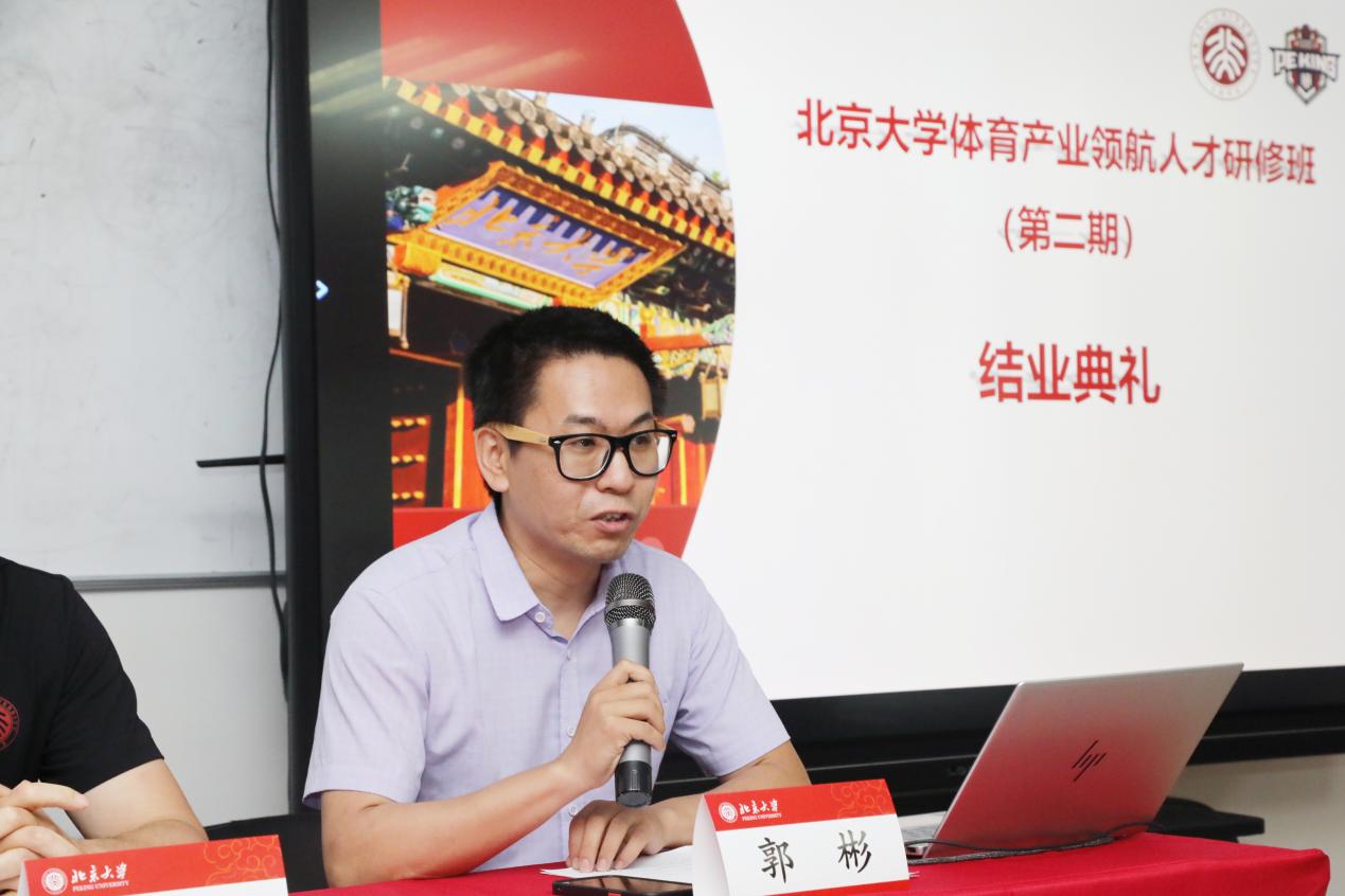 7月18日下午,北京大学体育产业领航人才研修班(第2期)结业典礼在邱德拔体育馆201教室举行。北京大学体育教研部继续教育负责人吴定锋、北京大学国家体育产业研究基地秘书长何文义、北京大学体育教研部教授亓昕、北京大学国家体育产业研究基地副秘书长郭彬出席典礼。